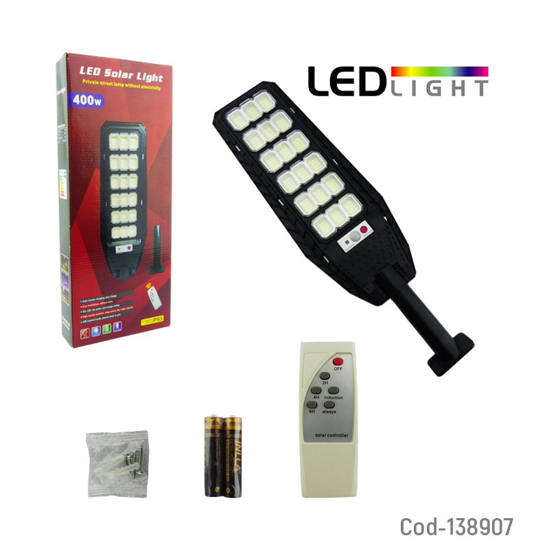 Foco con brazo solar de 400 watt 216 LED en 18 placas y control remoto. Ideal para iluminar mediante programación lugares extensos gracias a su gran potencia, incluye baterías para el control remoto y base para instalar con pernos y tarugos. Producto de alta calidad en caja.